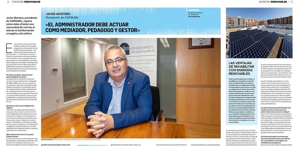 Gipuzkoa eta Arabako Finken Administratzaileen Lurralde Elkargoko (CAFGUIAL) presidente Javier Monterok Energía Renovables aldizkarian argitaratutako artikulu batean agertu da berrikitan. Bertan, finken administratzaileek eraikuntza-parkearen birgaitze- eta eraldaketa-prozesuan duten eginkizun erabakigarria aztertzen da.